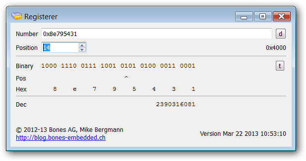 Dealing with registers could sometime be a straining job. To make my work somewhat easier I developed a small tool which is basically a bin/dec/hex converter aiming embedded developers which have to deal with hardware registers a lot. It\'s capable displaying bit positions as well as manipulating single bits.